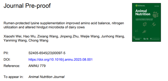 营养研究团队王翀、魏筱诗为指导老师,题为“Rumen-protected lysine supplementation improved amino acids balance, nitrogen utilization and altered hindgut microbiota of dairy cows”的研究论文。